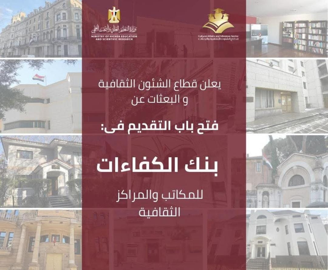يعلن قطاع الشئون الثقافية والبعثات عن فتح باب التقديم فى بنك الكفاءات للمكاتب والمراكز الثقافيةفي إطار الاستراتيجية الوطنية للتعليم العالي والبحث العلمي، والتي من بين مخرجاتها استكشاف الكفاءات المختلفة في مختلف المجالات من السادة أعضاء هيئة التدريس بالجامعات ( أستاذ- أستاذ مساعد) والتي من بينها أنشطة التعاون الدولي والعلمي والثقافي المختلفة والاستفادة منها في مختلف المجالات والتي من بينها المهام المؤقتة المرتبطة بالمكاتب الثقافية بالخارج عند الحاجة.